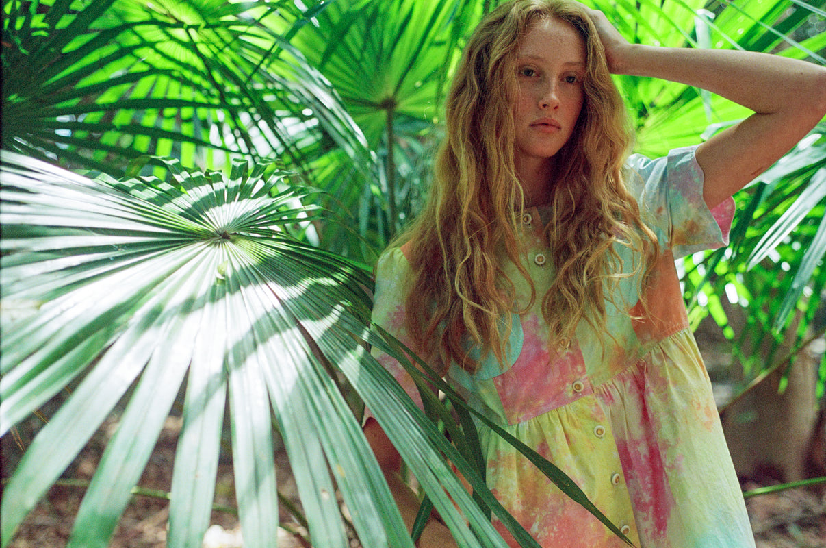 Dresses and shirts display contrasting panels of rainbow tie dye, designed to create interest within harmony. Pops of embroidery